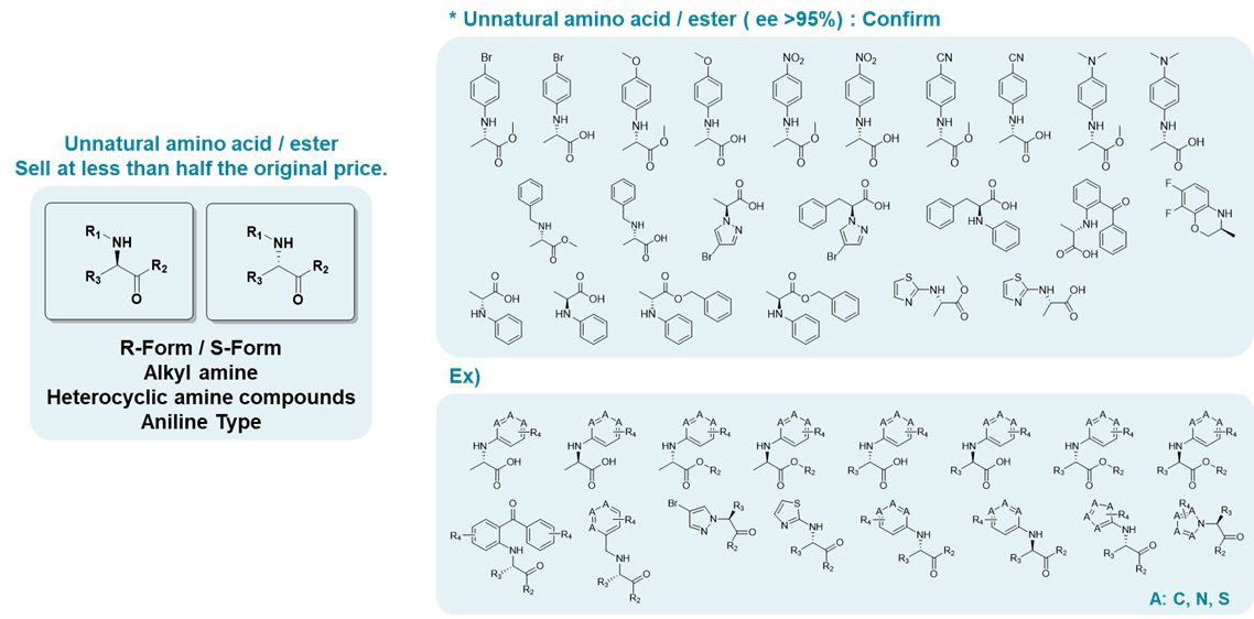 - Versatile Application: 비천연 아미노산·에스터 등 고부가 Building-Block 제품을 즉시 공급하며, 맞춤형 스케일-업 서비스도 지원함.